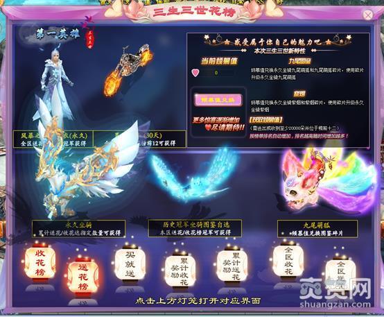 在520表白的日子里,将三生三世花送给今生挚爱!截止到5月20日23:55,三生三世花榜全服限时开启!活动期间累计送花或者收花达到指定数量即可获得永久坐骑,当送花或者收花达到400多以上时即可在花海获得一朵属于自己的花!
