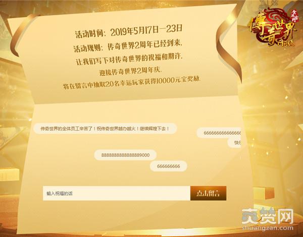 《传奇世界网页版》和玩家一起走过了两年,玩家心里一定有很多想对传世说的话,去庆典官网写出你对《传奇世界网页版》的祝福和期待,将在留言中抽取20名幸运玩家获得10000元宝奖励!马上点链接写祝福吧:http://hd.tanwan.com/huodong/cqsj/2019eznyr/year-znzf.html