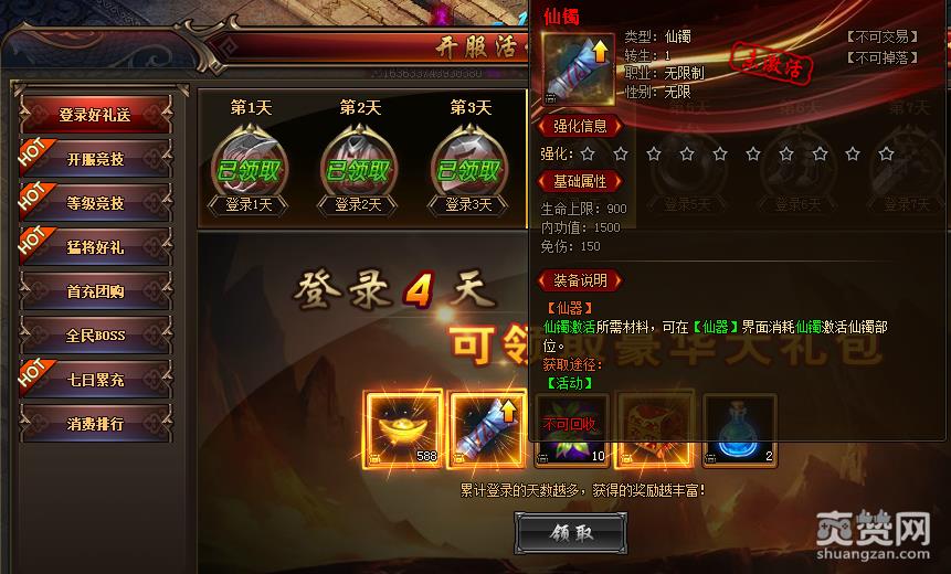 小伙伴们可不要小瞧了仙装哦,仙装只有在开服七天时间内累计登陆获得,仙装可以为人物角色附加很多很多的属性,最主要的是,我们的仙装可以使用灵髓结晶升级的,灵髓结晶只要保持在线就可以免费获得。想想是不是都觉得很刺激呢。