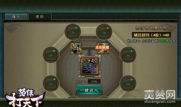 33456《范伟打天下》的老玩家都十分清楚战翼对于角色的提升非常大,有个高阶战翼不但可以提升海量的角色全部位属性,还可以提供伤害加深、减免等PVP属性,但是想要升阶战翼并没有那么简单。战翼升级:战翼首先需要使用战翼强化石提升战翼等级达到该等阶上限,如果没有达到将无法进行升阶。在战翼强化过程中存在成功率,运气好的玩家可以一路升到上限没有过多波折,而运气不好的玩家……好在战翼升级与装备强化类似,失败的话最差情况就是战翼降低一级。
