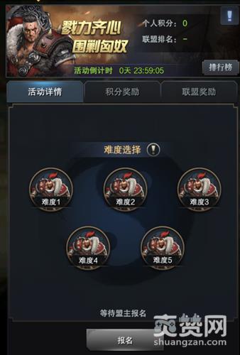 围剿匈奴活动需要联盟盟主报名后全盟成员才可参加。活动开启期间,活动页面会提供5种不同难度的任务以供选择,盟主可选择适合自己联盟的难度来报名。报名后,盟主附近会刷新匈奴大营以及八个八卦阵眼。盟主确认开启活动后,将进入40分钟倒计时,倒计时一结束,匈奴就会开始向周围八个八卦阵发起进攻。