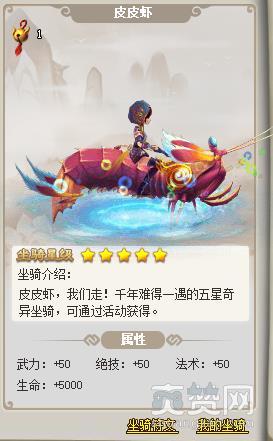 游戏中的五星坐骑本来就很稀少,这次的皮皮虾坐骑既然已经到来,大家就要抓住这个千载难逢的好机会了。皮皮虾坐骑的灵感来自于网络中的“皮皮虾,我们走”,外形的话也是十分相似的。至于属性的话,则跟其他五星坐骑一样,都是拥有武力、绝技、法术各加50,生命值加5000的属性加成。