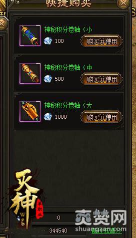 第三种方法是在商城购买神秘积分卷轴。商城中的神秘积分卷轴分为大中小三种,其中神秘积分卷轴(大)需要钻石1000,中需要钻石500,小需要钻石100。
