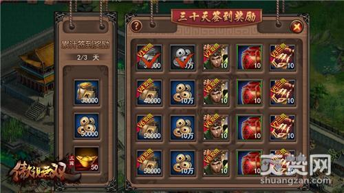 点击签到,会弹出“三十天签到奖励”面板,每日都是固定奖励,比如我们点击第一个格子,可以轻松获取30000粮草,VIP1可获取双倍福利,以此类推。左侧的累计签到奖励同样可以领取,倘若主公每天都访问此界面领取奖励,那该是多么大的一笔财富啊!