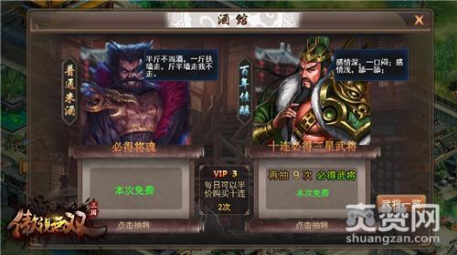 主公在酒馆中可招募武将,酒馆招募分为米酒宴请与陈酿宴请,米酒宴请需消耗女儿红,有可招募到低中资质的武将。陈酿宴请需消耗元宝,可招募到所有自制的武将。每隔一段时间,米酒宴请和陈酿宴请均可获得免费抽取的次数,等60级3个列传都出来时抽1-5次10连,有很大几率抽取最强武将碎片哟!