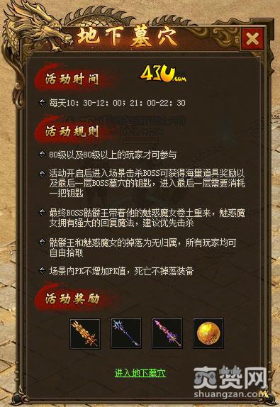 43u《暗黑灵界》骷髅王归来活动需玩家等级达到80级,活动时间为每天10:30-12:00和21:00-22:30。玩家可在活动面板点击小飞鞋传送到NPC旁边,点击“参加活动”就会传送到活动场景。