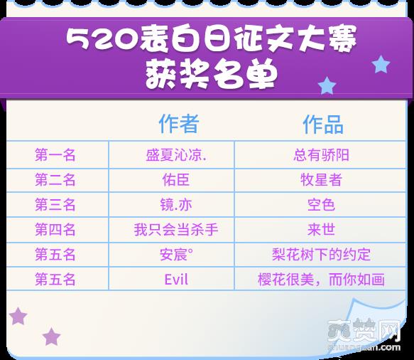 恭喜以上作者,将获得由《推理学院》为您颁发的“520表白日征文大赛”奖品以及“520恋爱家”永久纪念勋章一枚!