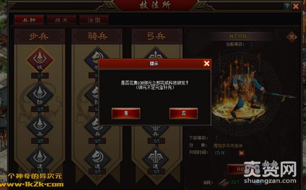 技法所,也就是科技所,这里主要是可以帮助玩家提升不同兵种的攻防等,科技所消耗开物图和银两帮助提升兵种属性,每一属性最高可提升到5级。科技升级时间随着科技等级的提高而增加,但是玩家可以点击时间旁边的三角进行元宝快速科技。