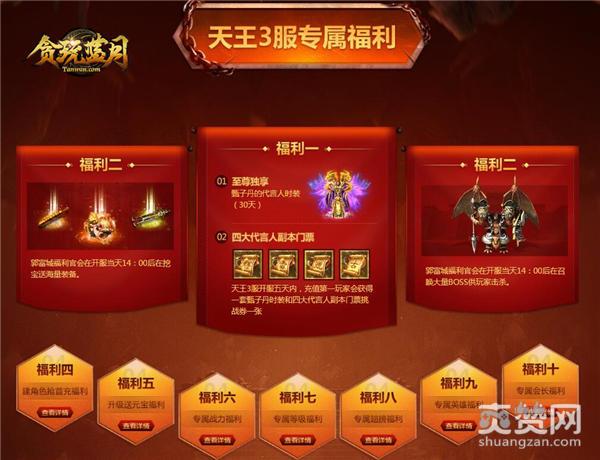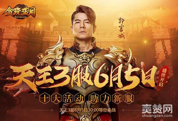 《贪玩蓝月》郭富城专服天王3区,当天最先创建角色的10名玩家赠送首充1000元宝,还有3大天王服3区特有福利!郭富城专服天王3区开服五天内,充值第一玩家会获得一套甄子丹时装和四大代言人副本门票挑战券各一张!在开服当天14:00后在召唤大量BOSS供玩家击杀,,一刀满仓so easy!天王还亲自挖宝随机送海量装备!
