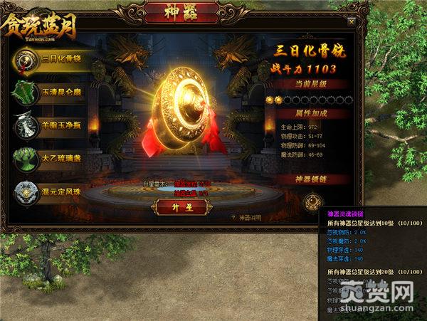 《贪玩蓝月》本次更新的“神器”系统,可以说很多玩家十分期待的功能,只要角色转生等级达到7转的玩家,即可开启“神器”系统,神器共有十个:三日化骨铙、玉清昆仑扇、羊脂玉净瓶、太乙琉璃盏、混元定风珠、生死阴阳镜、七宝玲珑塔、须臾风火轮、九龙避火罩、紫金宝葫芦。