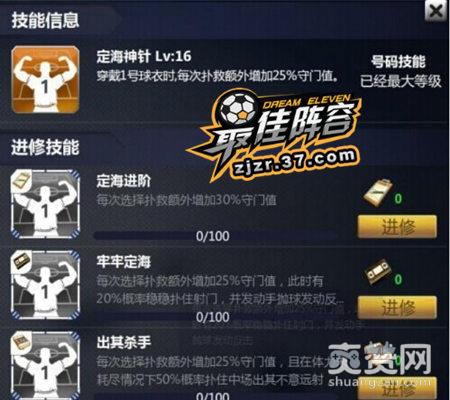 1、定海进阶:每次选择扑救额外增加30%守门值;
