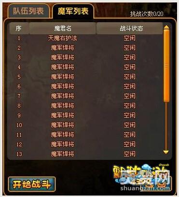 队伍列表与魔军列表,可以选择空闲的魔军进行挑战。