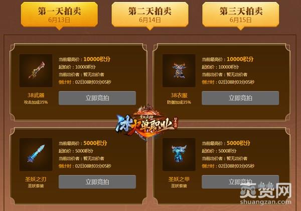 拍卖期间,每天都会进行拍卖活动,每天只限量放出4个道具进行竞拍,玩家可要把握住机会啦!三天拍卖的道具都不一样,惊喜多多!高阶武器、圣妖套装在向你招手哦!听说就连春哥对这些竞拍品也是喜欢得不得了哦!