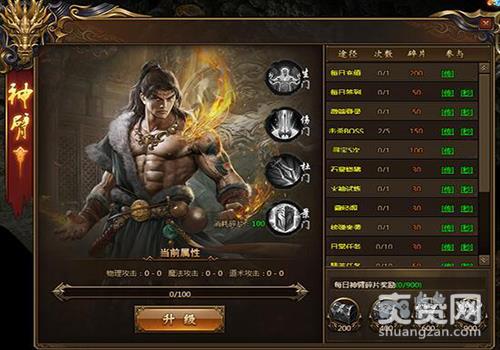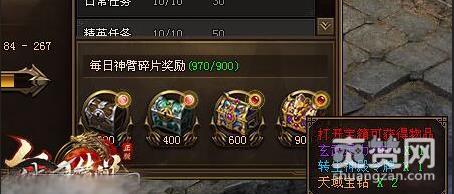 我们每天可以获得四个宝箱,分别在200碎片、400碎片、600碎片、900碎片时获得。获得的碎片我们可以用来升级神臂系统,神臂每升一星就可以获得攻击属性的奖励,每十星升一阶,在达到三阶、四阶、六阶、七阶时可以激活神臂技能,获得生命上限、怪物增伤、额外伤害、伤害减免四个属性的加成。