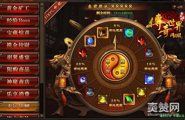 《传奇世界网页版》豪华奖池出现啦!谁会是被好运加持的幸运儿呢!活动开启后奖池内默认存入88888元宝,玩家每抽奖1次可使奖池内增加100元宝!每次花费500元宝或神秘礼券可进行一次抽奖,每次抽奖将会优先消耗神秘礼券哦!豪华奖池的中奖率高达100%!你是传世锦鲤吗?快来领走奖池元宝!