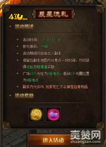 43u《传奇世界》晨星洗礼活动入口在城主之刃NPC处,玩家们等级达到70皆可参与,在活动期间可以随意进出副本。