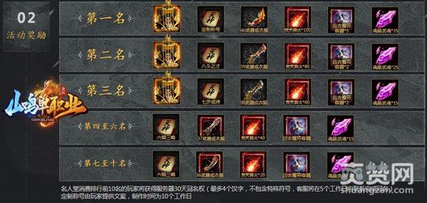 活动期间,只要玩家消费总额满30万钻石,排行前十的玩家将获得把自己的名字载入"山鸡单职业名人堂"史册的特有机会!同时还有丰厚的奖励一并发放!