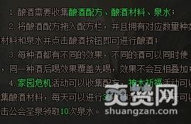 酿酒的配方玩家可以参加家园危机活动去获得。酿酒材料可以通过萝卜玩《传奇霸业》游戏中的神木祈福活动获得,泉水通过公会圣泉活动获得。