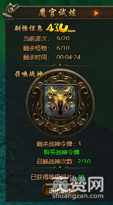 玩家进入魔宫试炼后,可以召唤战神帮助战斗,每次进入副本可以召唤两次免费战神,然后继续召唤的话需要战神令牌。每次副本最多可以召唤10个战神。