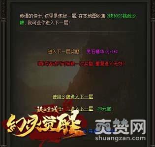 炼狱之路共有十层,每层都有进入到下一层的NPC,每下一层需要消耗BOSS挑战令牌,同时可获得一定数量的灵石精华奖励.玩家到达炼狱之路层数越高,那么需要消耗的BOSS挑战令牌越多.在炼狱之路每一层均有一只BOSS,BOSS被击杀后有几率掉落高级装备,玩家击杀小怪可以获得BOSS挑战令牌.