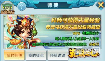 刚进入《无限之心》如果玩不懂怎么办?如果身边没有一同游戏的亲朋好友,拜师是一个不错的选择,游戏中遇到的困难和问题通通可以找师傅来帮助,而且师徒双方都可以得到好处~拜师可以获得大量经验,收徒则可以获得大量经验和威望。师傅还可以给徒弟传功帮助徒弟修行。在维持师徒关系八天以后,徒弟就可以出师啦!出师后师徒双方都能获得极品道具奖励!