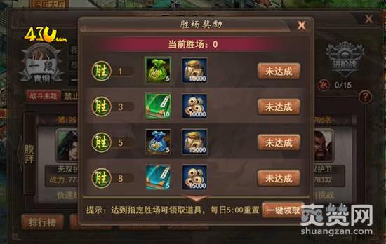点击界面中的膜拜按钮,可查看当前段位前4名玩家,点击玩家头像下方的膜拜按钮,即可对该玩家进行膜拜。膜拜玩家可获得铜钱奖励,每日最多只可进行3次膜拜。05时重置膜拜状态。每周一凌晨05时重置段位及排名,并开启下一期争霸,所有玩家将从青铜段位重新开始战斗。