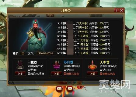 给关公上香后,关公就可以获得灵气,灵气积攒到一定数量时关公就会升级,越高级的香一次可以提升关公灵气的数值就越多。关公等级会直接影响武神祝福时经验加成的百分比,1级关公可以增加副本经验100%。关公等级越高,增加的副本经验也就越多。