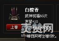 每位大侠每日只能上一次香,所以大家需要根据自己的情况来选择上香的种类。其中,上白檀香需要消耗100阅历,可以获得武神祝福60次,10点声望值。上苏合香需要消耗30元宝,获得武神祝福120次,100点声望值。上天木香需要消耗90元宝,获得武神祝福360次,1000点声望值。