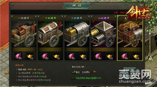 目前在游戏中有五种等级的镖车,奖励依次递增,但即便是最“便宜”的一级镖车,产出的神石碎片和元宝数量也是非常诱人的。在真正押送之前需要先刷新一下,刷新需要消耗押镖令牌/10钻石,如果你担心自己的镖车会被劫,可以购买保险。购买保险押运成功获得120%奖励,购买保险车被劫仍可获得100%奖励!