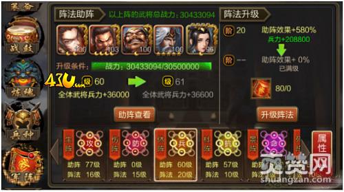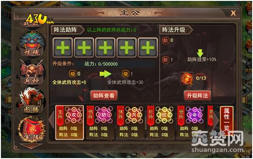 阵法布阵自然是需要主公自己去排兵布阵了,如果主公想快速增加战力,让战力突飞猛进的话,建议优先把主队放在休阵,该阵法主加兵力,兵力增加是游戏里面增加战力最快的途径哦!根据不同的战力,阵法助阵会有不同的等级,并且有不同的属性加成,最高为100级助阵等级,战力需求为5000W。