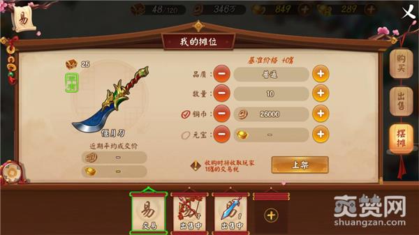 点开交易行的摆摊功能会出现三个卷轴,点击出售,玩家可以将自己以有的装备进行贩卖。
