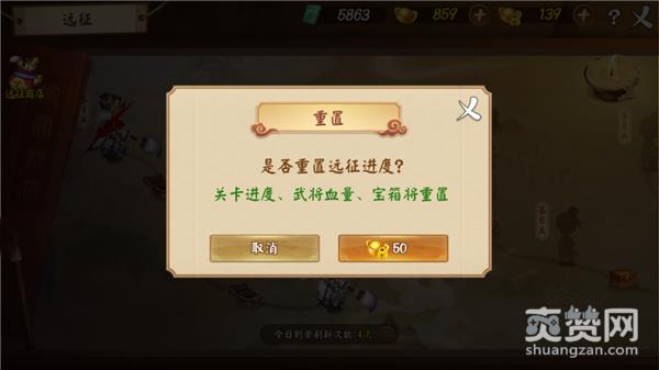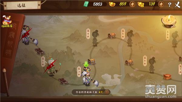 每战胜一道关卡,玩家除了会获得铜币与斩将令,还会获得随机的珍稀材料奖励,材料等级与数量都是不固定的,这一切就要靠各位的人品了。远征玩法一天还有4次的重置机会,缺少材料的玩家可以利用元宝来重置远征进度,来不断的获得奖励。