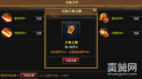 灵件中最高品质的应该就是金色灵件了,洗练出的属性会比其他品质灵件高出很多,作用非常之大。金色灵件只能通过兑换获得,每6个天地玉牌就可以选择一个金色灵件进行兑换了。而天地玉牌则可以通过境界点来兑换,20境界点兑换一个天地玉牌,不过需要玩家的吉星高照境界等级达到3级之后才会开启天地玉牌兑换功能,还没达到要求的玩家就要快点收集境界点了。