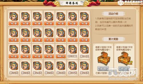 在进行神将签到时,玩家每累计签到7天可获得1个专属宝箱,每累计充值7天可获得2个专属宝箱以及增加7次签到次数,赠送的签到次数需要在当天使用。
