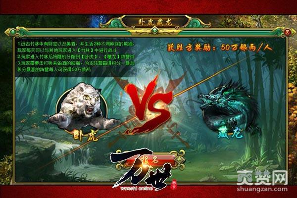 【卧虎藏龙 实力夺取财富】 想要富可敌国的身家?想要打怪打得痛快?那就到大黑《万世》中参与卧虎藏龙,体会个中激情吧!在每日举办的卧虎藏龙大会中,你需要击杀敌方的熊猫,全力以赴为己方夺得大量积分。手速战力代表一切,你和同营小伙伴的精彩表现,将会为你们带来丰厚的奖励,大量银两财富等你们来夺!