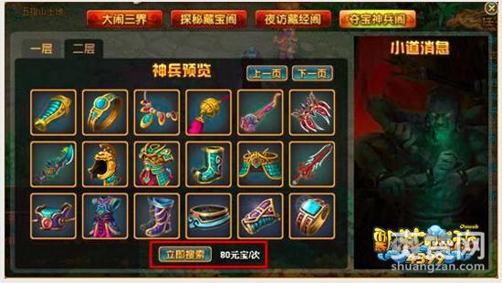 神兵阁一层中,玩家可搜寻到人物对应等级的2-5星副本装备,人物对应等级+10的2-5星副本装备,以及60级神器碎片。神兵阁二层中,玩家可搜索到相应等级的3-8星副本装备,人物对应等级+10的3-6星副本装备,以及80级神器碎片。