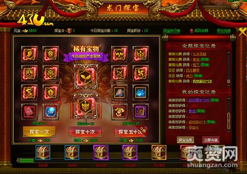 43u《九曲封神》中玩家参与龙门探宝活动时,每次需要消耗探宝令1枚,就可获得各种进阶材料和不同品阶套装。使用绑定探宝令探宝必得绑定物品,探宝后获得的奖励将存放在探宝仓库内。而且探宝获得的BOSS积分可在积分兑换内兑换极品装备或道具。