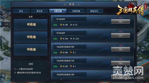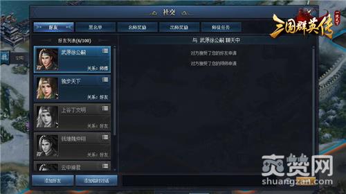 为了加强玩家间的交流,360《三国群英传一统天下》设计了社交系统,当角色等级达到1级后即可开启。进入社交系统后,你会看见五项分类,分别是:好友、黑名单、名师奖励、出师奖励、师徒任务,每个面板的表现形式和作用都是不同的。