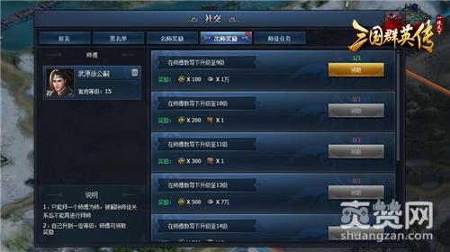 师徒齐心,其利断金。每天系统都为师徒准备了惊喜的师徒任务。每天有一项特定任务,师徒需要携手并进将其通过,就可以获得价值不菲的奖励,比如自选卓越魂将、万能神纹碎片等奖励,犒劳在三国中英勇奋战的你!