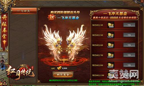 新服基金分为两种,一种为“一飞冲天基金”。基金内容为,新服创号后48小时内,花费8888元宝购买4阶翅膀直升丹【3阶翅膀使用】可以获得以下返利。