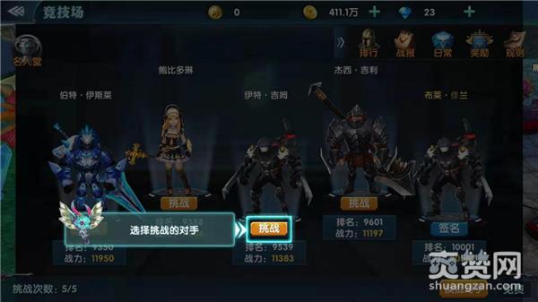 在竞技场中,玩家每日会有5次免费挑战次数,还可以花费钻石购买挑战次数。战胜其他玩家会获得积分,并且挑战方的排名低于被挑战方,战斗胜利后排名会进行互换。如三分钟挑战方没有战胜被挑战方,即判挑战方战斗失败。