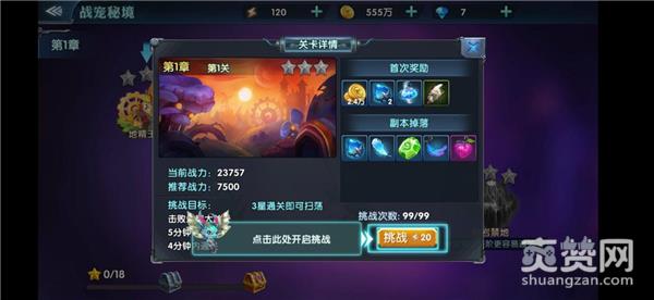 每挑战一次需要花费20点体力值,每个关卡有明显的战力标识,战力不达标的冒险者千万不要轻易尝试。首次通过关卡会获得指定的物品道具,另外关卡还会随机掉落一些用于战宠升级、升星、升阶的材料。
