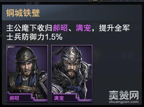 满宠的突破加成均是关于步兵的提升,前三阶段分别能够提升部队步兵15%的攻防以及10%的连击、穿透、抵抗和护盾。突破到第三阶段,满宠的两大技能“奋起·步”和“严法”都将得到10%的效果增强。也就是说,此时的“严法”技能可以减少骑兵30%克制系数。当满宠突破到第四阶段,将会解锁技能“掌刑”,这一技能可以降低敌方士兵穿透20%,从侧面进一步加强我方步兵的生存能力,为各位主步兵的主公带来极大的助力。