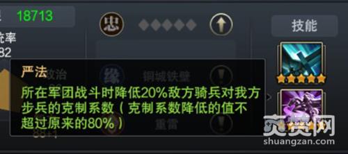 满宠的第一个技能是步兵将常规技能“奋起·步”,可以增加部队步兵攻击力20%。但他的第二技能“严法”才是其强势所在,这一技能可以降低敌方骑兵对我方步兵的克制系数20%(克制系数降低的值不超过原来的80%),进一步加强了步兵在游戏中的地位。