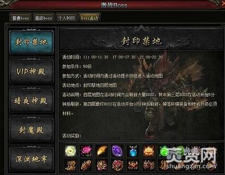 在923yx《七杀》中还有一种专属于自己的个人BOSS,击杀后会掉落装备。每个BOSS每日只可挑战5次,每次挑战需要消耗独享BOSS令。除了上述BOSS外,923yx《七杀》BOSS活动中的BOSS更为强大,奖励更为丰厚,比如“封印禁地”、“VIP神殿”、“暗夜神殿”、“伏魔殿”以及“深渊地牢”。