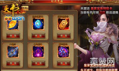 用“时间兑换金钱”是ppwan《天书世界》的核心思想,因此,在ppwan《天书世界》中还有时间商城。在线就可获得时间积分,用时间积分兑换各种游戏道具,真正实现用“时间兑换金钱”。还有全新的皇家宝库等着玩家来领取!