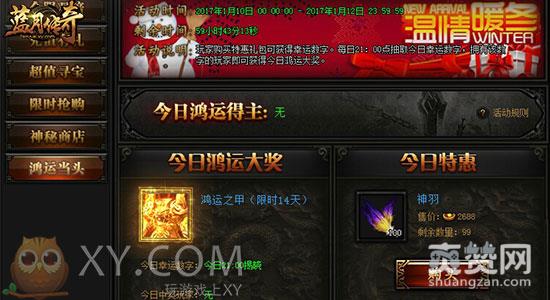 既然是庆典,经典活动当然一个都不能少。活动第一天,XY游戏《蓝月传奇》全服依然会开启双倍,海量经验轻松获得,而且可以与多倍经验卷轴和VIP经验buff叠加,同时使用效果更佳!此外,活动期间每日充值2000元宝,还可以获得超级豪华大礼包,大量功勋,海量材料等你来拿!假如材料还是不够怎么办呢?别担心!限时抢购帮你忙!XY游戏《蓝月传奇》暖冬活动期间,极品材料特价限时出售,超低价格让你实力飞速提升,一步登天不是梦想!另外,购买完特惠礼包,每天晚上别忘了来开奖哦!活动期间,鸿运当头活动同时开启,脱非入欧,就看这一次了!谁能拿到传说中的鸿运之甲?是你么小伙子!