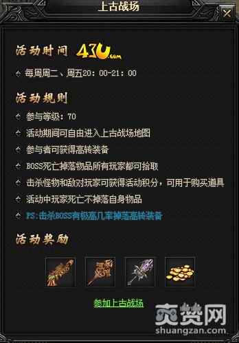 玩家们等级达到70级即可参与,在活动期间大家可以自由进入上古战场地图,参与者皆可获得高转装备。