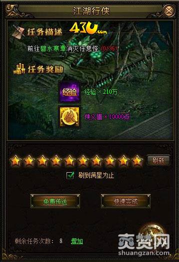 43u《九阴绝学》江湖行侠为简单的杀怪任务,只要消灭指定怪物就可以快速完成啦。接取任务前,只要花费少许铜钱就可以刷新任务星级,星级越高,完成任务可以获得的奖励就越多,建议各个玩家最好刷新任务为满星后再接取。