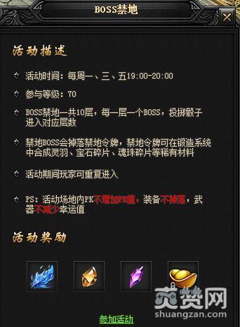 BOSS禁地一共有10层,每层一个BOSS,投骰子进入对应的层数。BOSS禁地会掉落禁地令牌,令牌可在锻造系统中合成灵羽、宝石碎片、魂珠碎片等稀有材料。活动期间玩家可以重复的进入。活动场景内PK不增加PK值,装备不掉落,武器不减少幸运值。
